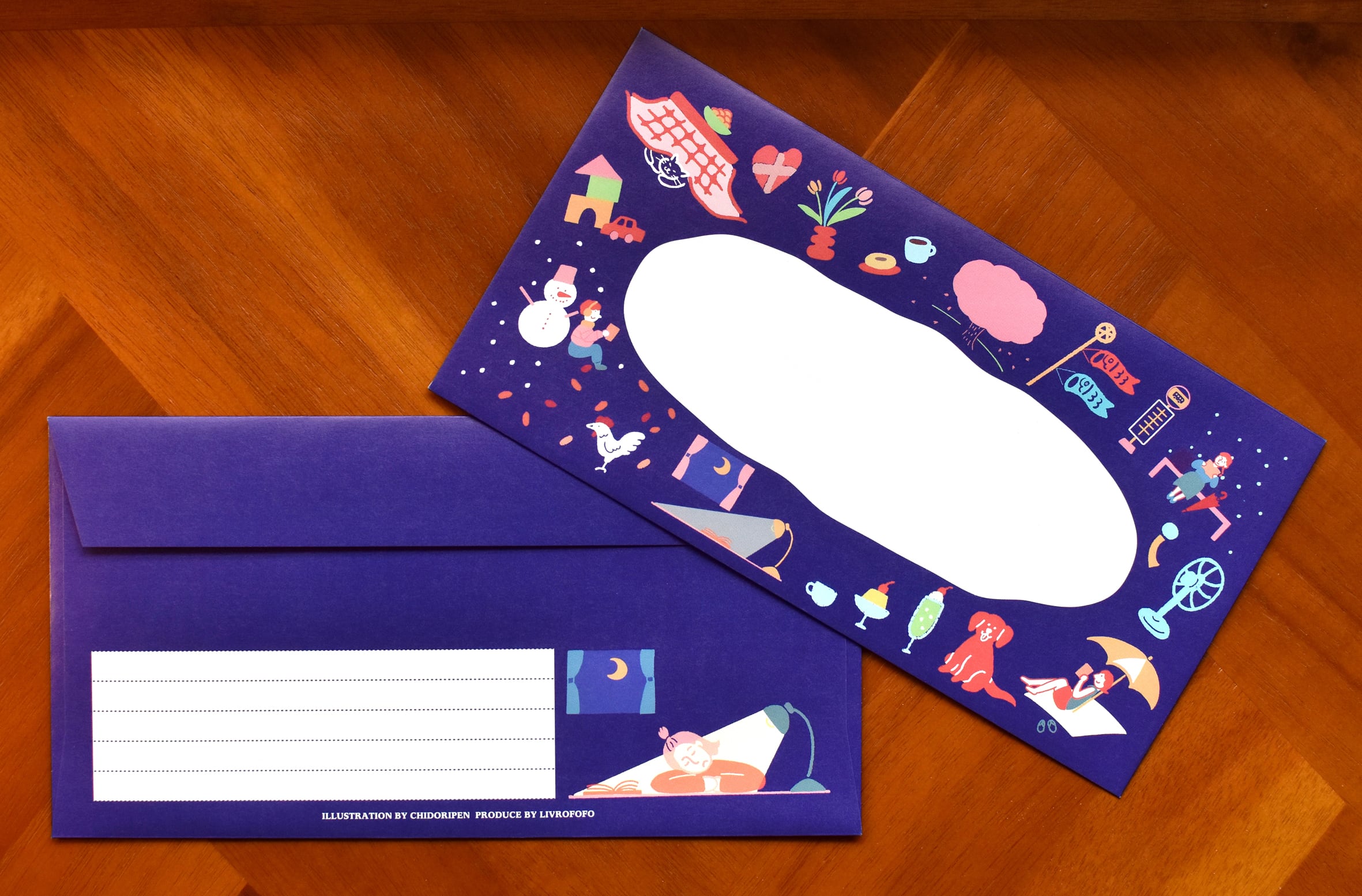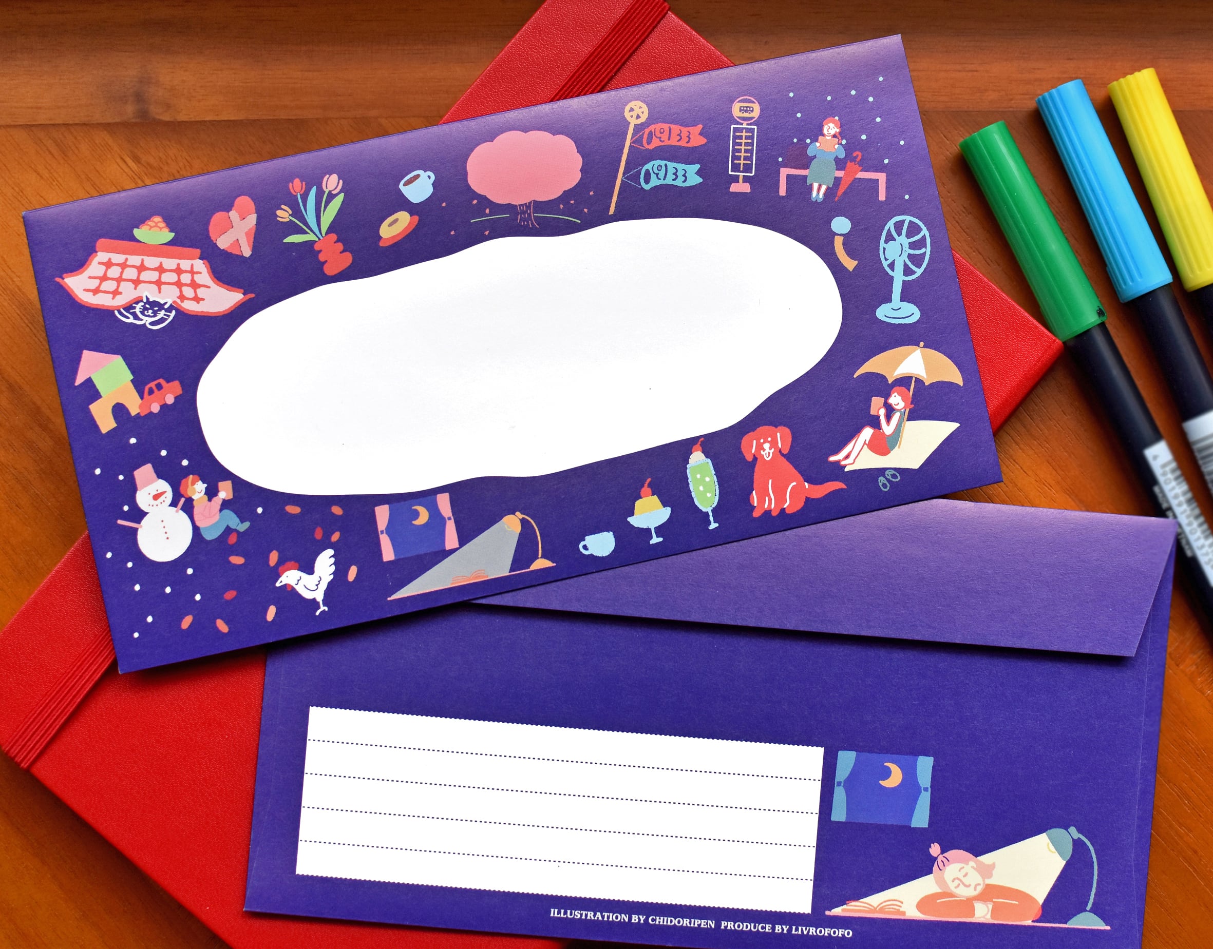 四季と共に”本”を楽しむ様子を描いた封筒です。